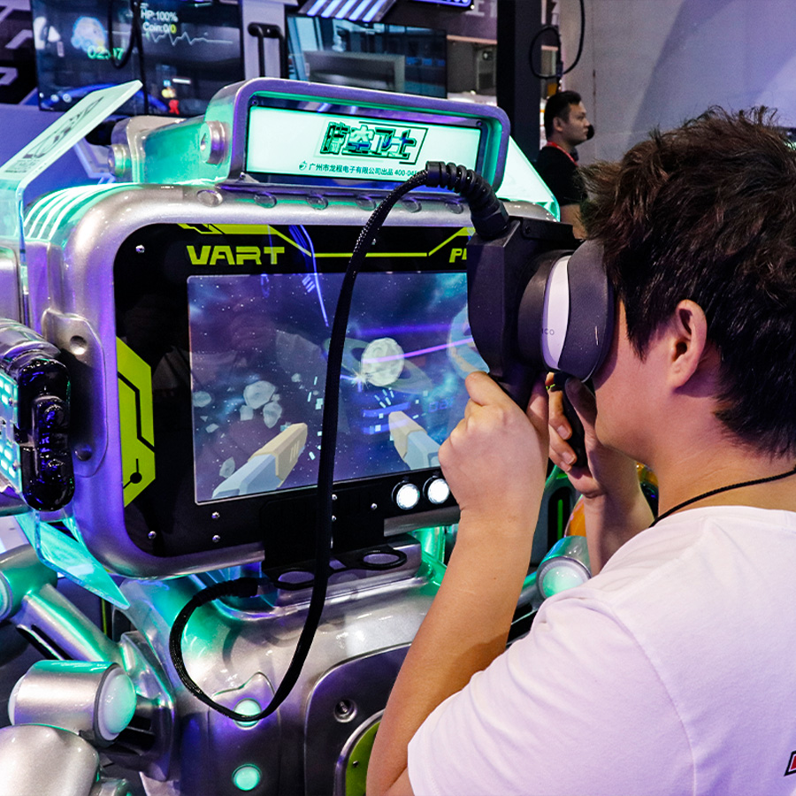 時(shí)空衛(wèi)士是一款創(chuàng)新型共享式VR自助游戲機(jī),結(jié)合了炫酷的未來科技外觀,便攜式佩戴,多種射擊游戲主題以及卡片獎(jiǎng)勵(lì)的功能,為玩家提供前所未有的沉浸式游戲體驗(yàn)。